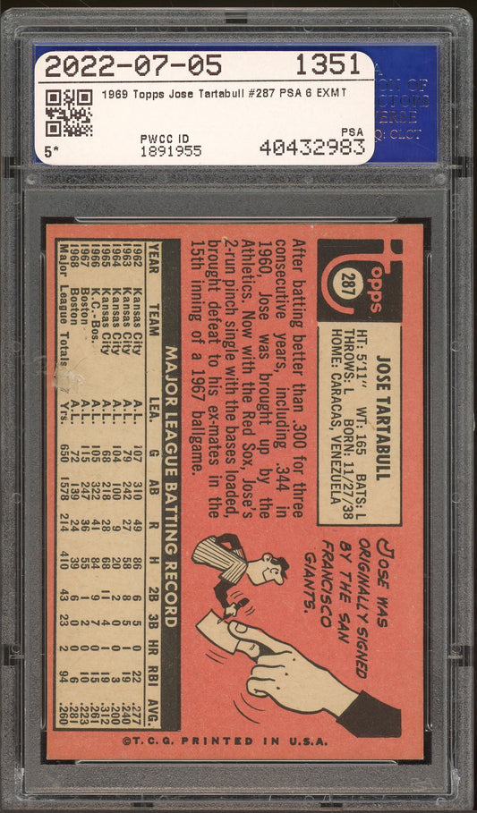 1969 Topps #287 Jose Tartabull PSA 6Regular price $19.99 USDRegular priceUnit price per-