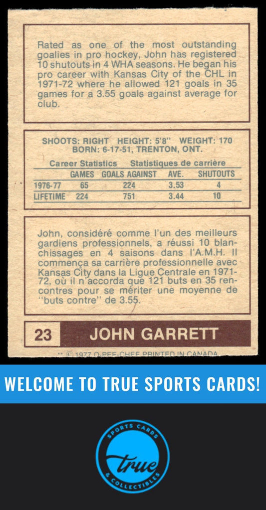 1977-78 O-Pee-Chee WHA #23 John Garrett AUTOGRAPH
